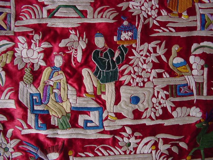 Nineteenth century Parsee traders returned to India from Canton with embroidered silk cloth which was fashioned into unique saris which came to be known as garas