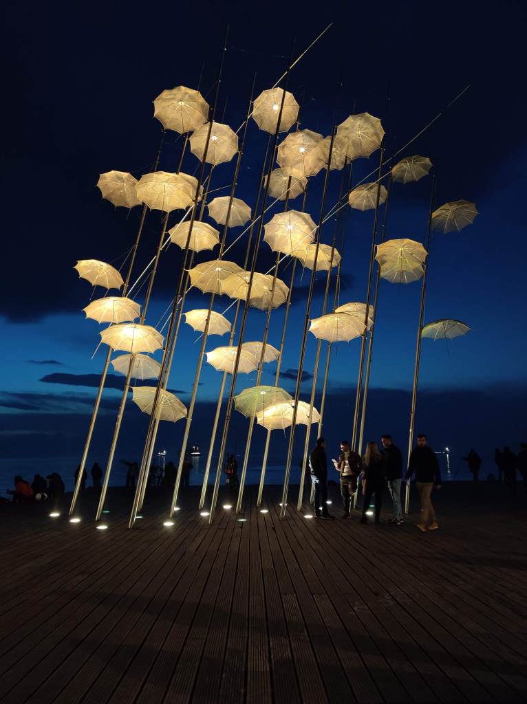 Nea Paralia thrums with buskers, cyclists whizzing by on rented bikes as is the norm in Thessaloniki, and locals fishing along the waterfront. We wonder whether we should take the 30-minute harbour cruise around the Thermaic Gulf or sit at a bench enjoying the seaside view, hoping for a glimpse of Mount Olympus. Finally, we decide to treat ourselves to our final Greek sunset at “The Umbrellas”—an art installation along the harbour that lights up at night. As we click our share of romantic photographs under sculptor George Zongolopoulos’ stainless steel umbrellas in the moonlight, I remember Choumnos’ words: everyone will have a home as long as Salonica exists. And I send out a wish to the city, hoping it’ll beckon us back again, to uncover more secrets.